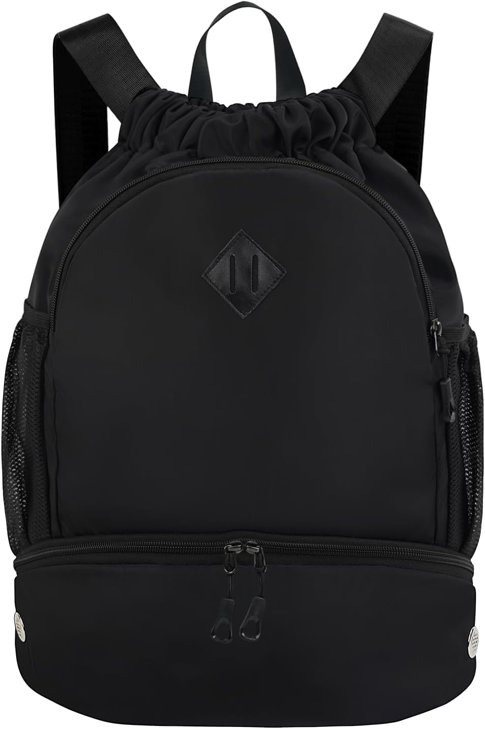 Drawstring Backpack Gym Backpack with Shoe Compartment for Men Women String Sports Bag with Wet Pocket Cinch Swim Beach Bag, Black (Patent Pending)